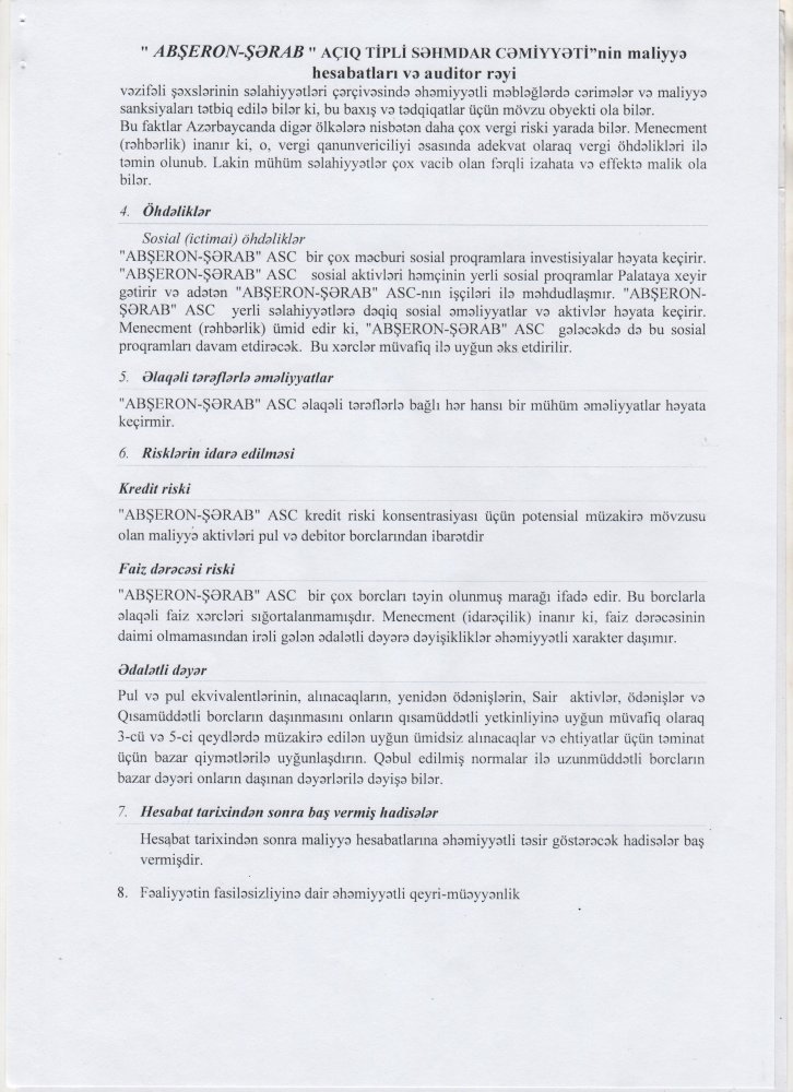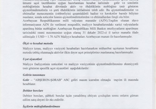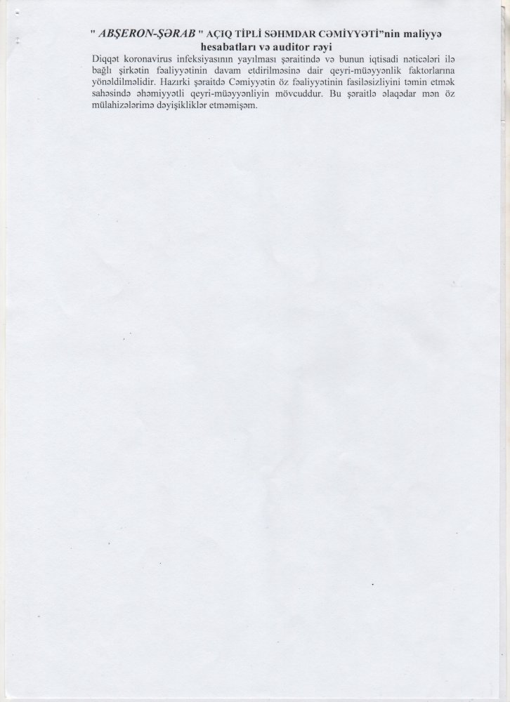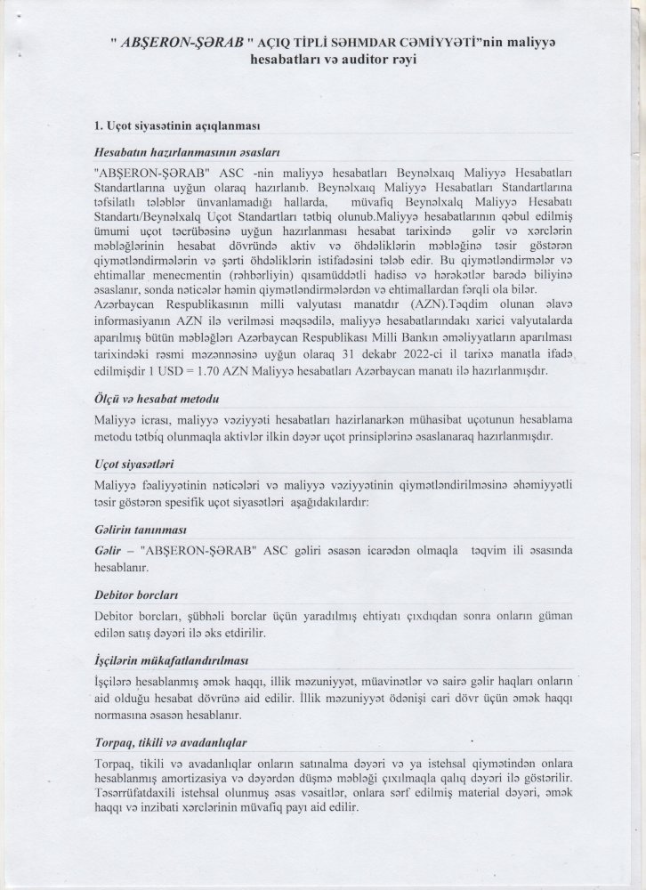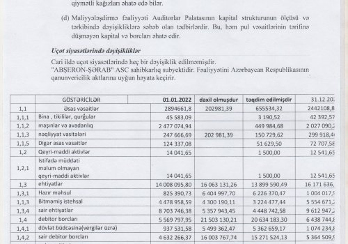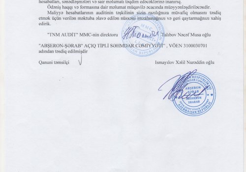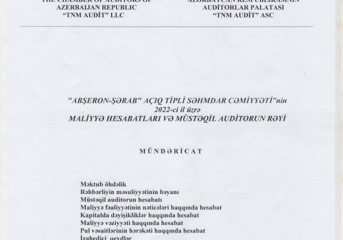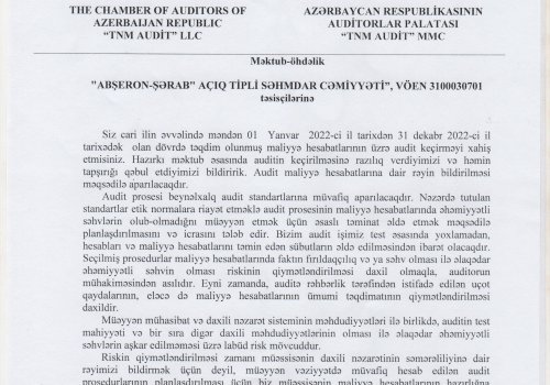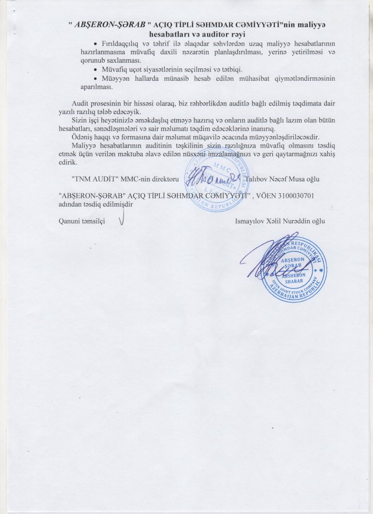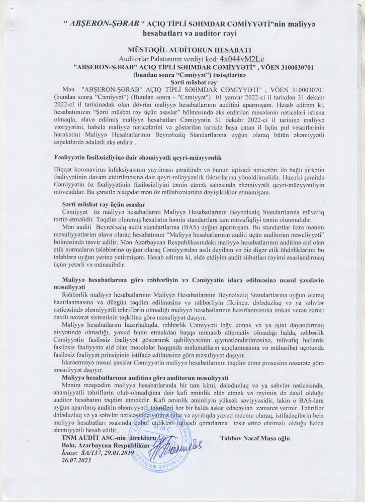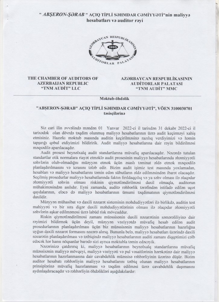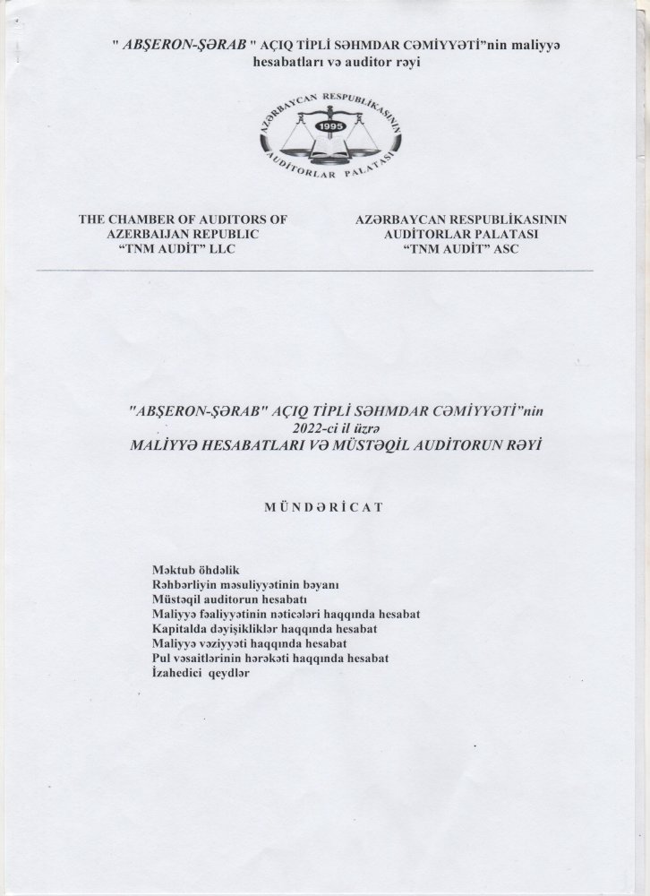 Abşeron-Şərab ASC-nin 2022-ci il üzrə Maliyyə Hesabatları və Müstəqil Auditi Azərbaycan Respublikasının Auditorlar Palatası tərəfindən akkreditə edilmiş TNM AUDİT ASC şirkəti tərəfindən həyata keçirilmişdir.