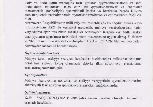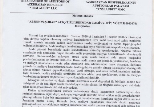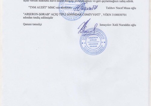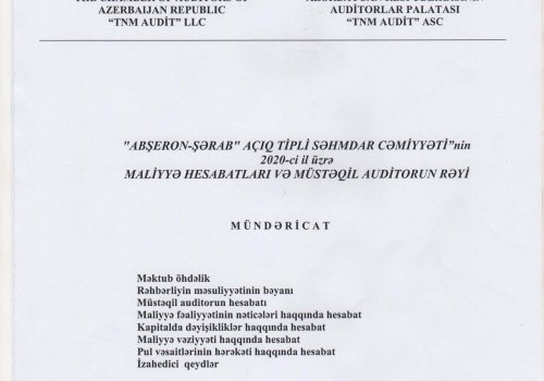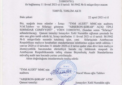 Abşeron-Şərab ASC-nin 2020-ci il üzrə Maliyyə Hesabatları və Müstəqil Auditi Azərbaycan Respublikasının Auditorlar Palatası tərəfindən akkreditə edilmiş TNM AUDİT ASC şirkəti tərəfindən həyata keçirilmişdir.
