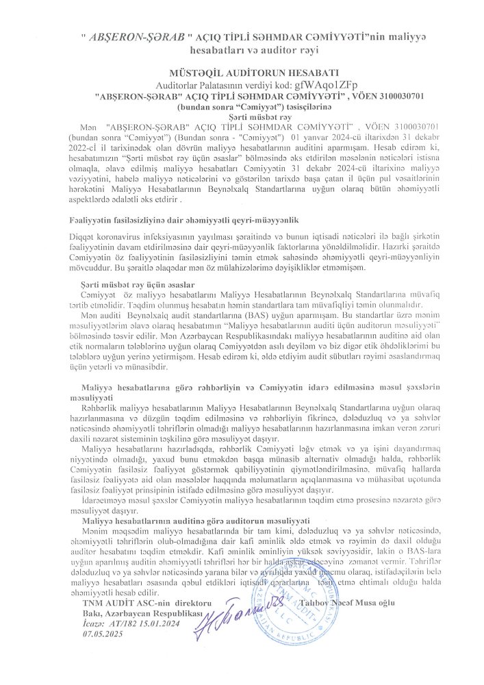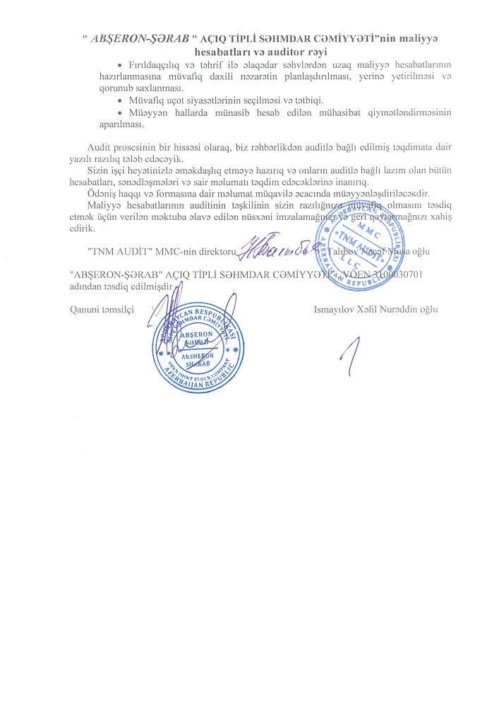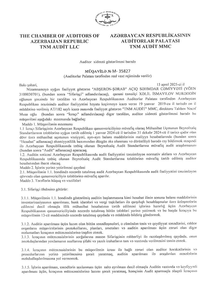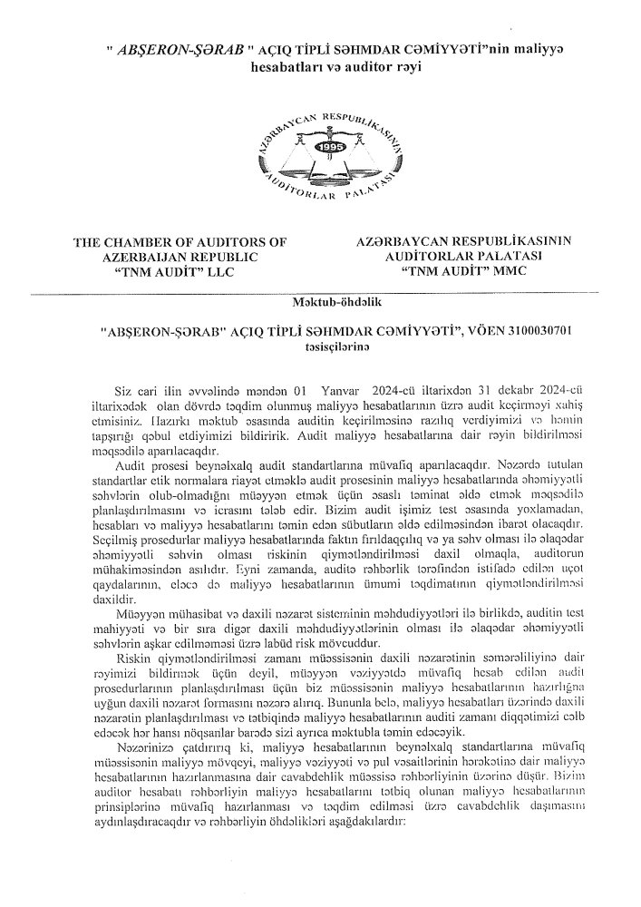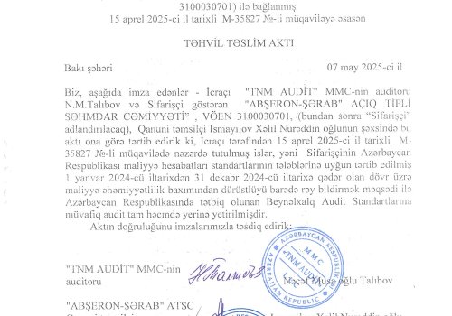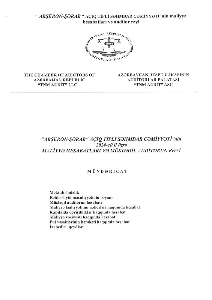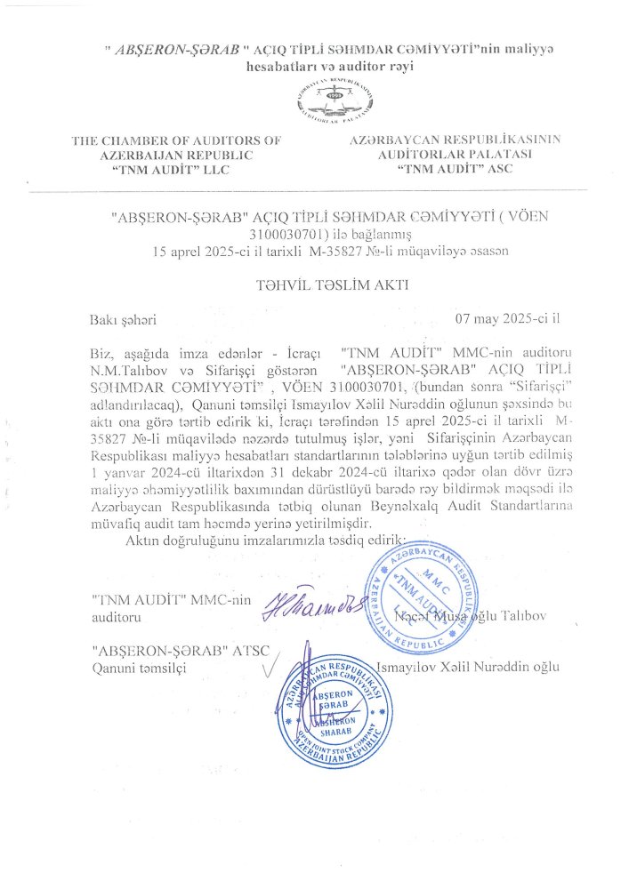 Abşeron-Şərab ASC-nin 2024-ci il üzrə Maliyyə Hesabatları və Müstəqil Auditi Azərbaycan Respublikasının Auditorlar Palatası tərəfindən akkreditə edilmiş TNM AUDİT ASC şirkəti tərəfindən həyata keçirilmişdir.