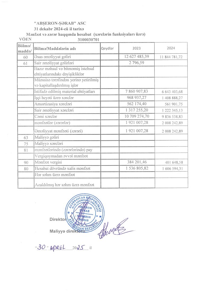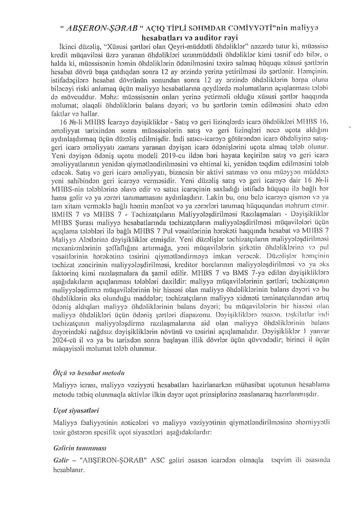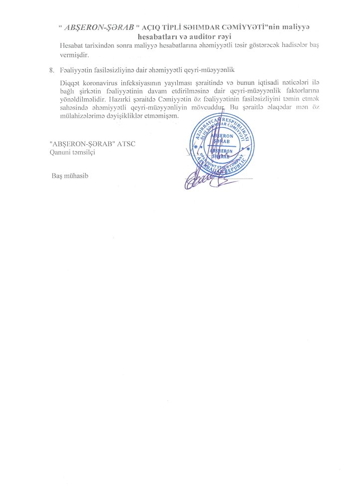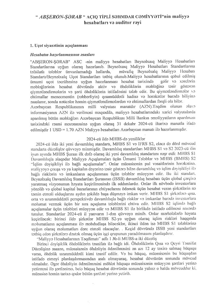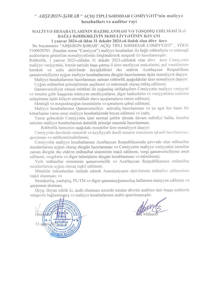 Abşeron-Şərab ASC-nin 2024-ci il üzrə Maliyyə Hesabatları və Müstəqil Auditi Azərbaycan Respublikasının Auditorlar Palatası tərəfindən akkreditə edilmiş TNM AUDİT ASC şirkəti tərəfindən həyata keçirilmişdir.