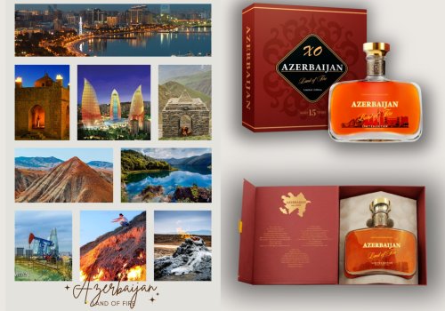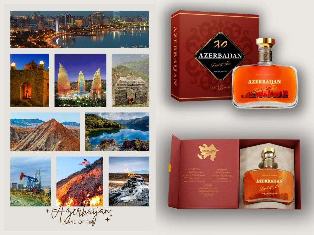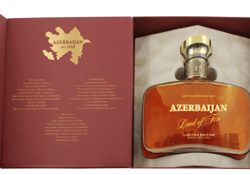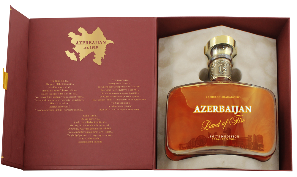 The brandy is presented in an elegant gift box, featuring exclusive interior design created specifically for this release. The inside reveals a stylized map of Azerbaijan, key historical references, and evocative phrases in three languages that capture the nation's essence as the Land of Fire, a crossroads of cultures, and a land of captivating beauty. This thoughtful presentation transforms the product into a memorable gift, deeply connected to the heritage and spirit of Azerbaijan.
