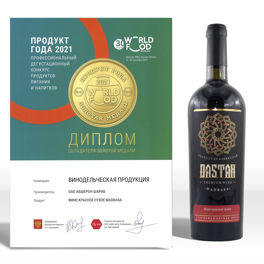 Высшая награда — Золотая медаль! Ею было отмечено наше красное сухое вино «Madrasa». Этот насыщенный и благородный напиток получил высшую оценку экспертов.